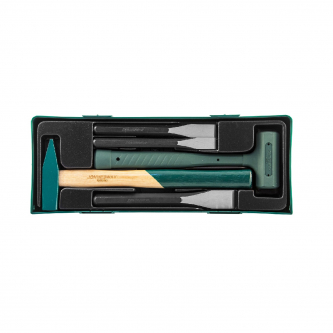 Jgo. de cinceles, marro y martillo en charola con 5 pzas.