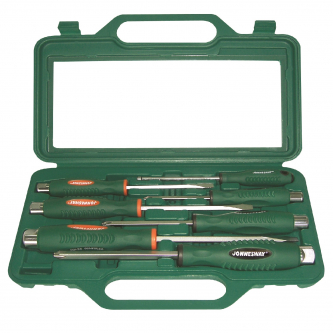 Jgo. de desarmadores de impacto, puño ergonómico, estuche plástico con 7 pzas.
